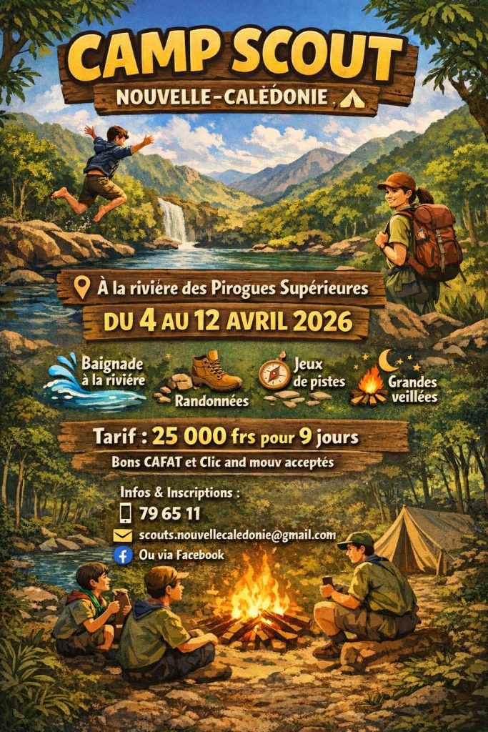 Les inscriptions sont ouvertes dès maintenant pour la période du 4 au 12 avril 2026. Le tarif est fixé à 25 000 frs pour 9 jours d’aventure. Les organisateurs acceptent les bons CAFAT et le dispositif Clic and mouv. Tu peux contacter les responsables au 79 65 11 ou par mail à scouts.nouvellecaledonie@gmail.com. Réserve ta place rapidement car le nombre de participants est limité.