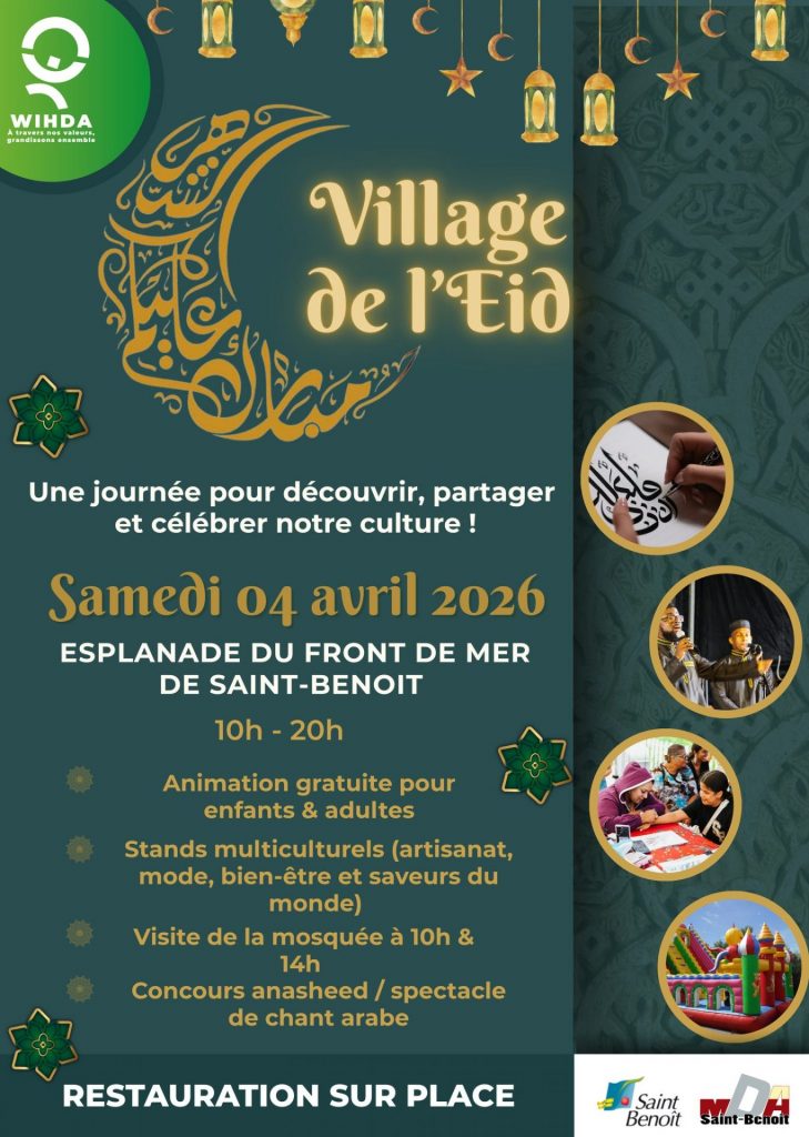 La Ville de Saint-Benoît s’anime pour une journée d’exception. En partenariat avec l’association WIHDA. La municipalité organise le Village de l’Eid le samedi 04 avril. Cet événement célèbre la fin du ramadan sur l’esplanade du front de mer. Vous découvrirez une ambiance riche en couleurs et en saveurs de 10h à 20h. C’est un moment privilégié pour vivre la fraternité réunionnaise.