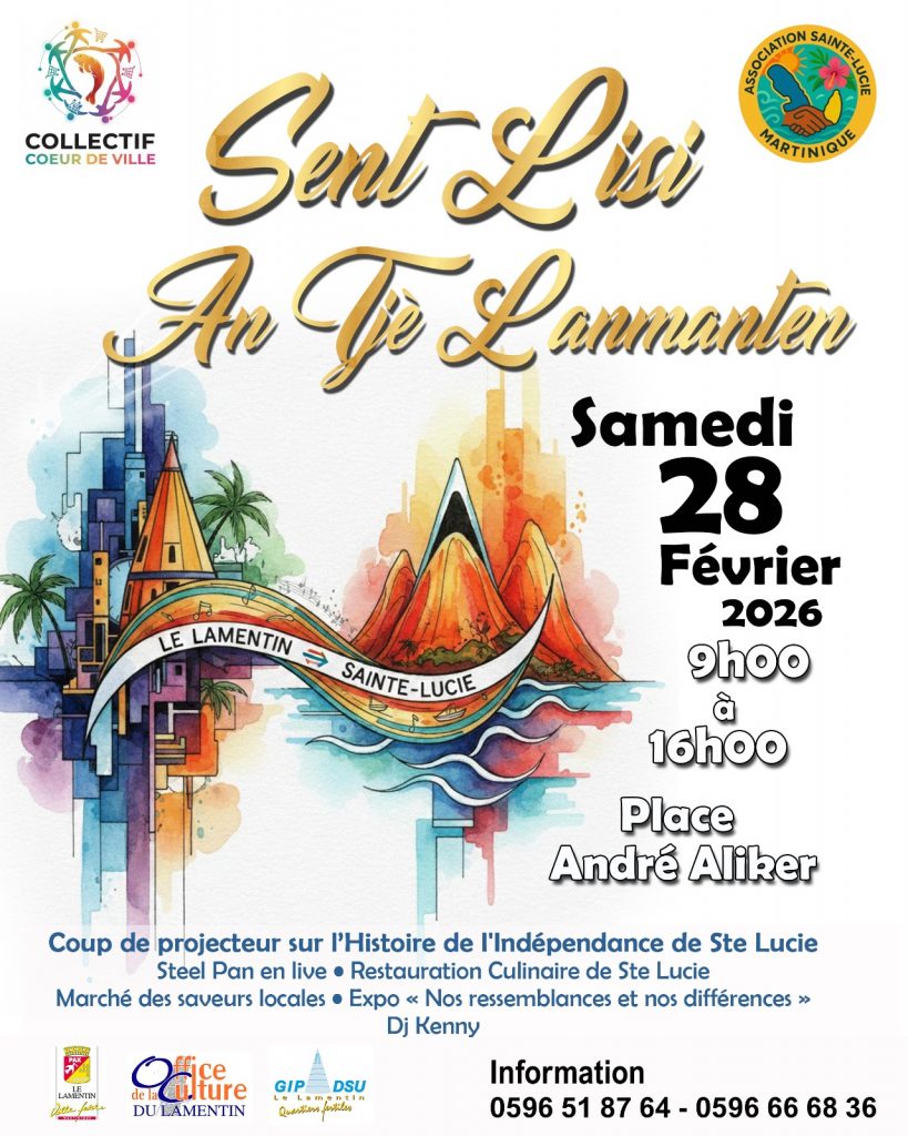 Le samedi 28 février. Le Collectif Cœur de Ville et l’association Sainte-Lucie Martinique organisent une journée exceptionnelle. L’événement « Sent Lisi an tchè Lanmanten » met à l’honneur l’île voisine. Cette manifestation marque le 47ème anniversaire de l’indépendance de Sainte-Lucie. La Ville du Lamentin en Martinique devient le centre de la fraternité caribéenne pour une journée.