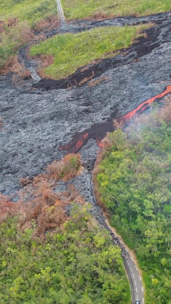 Le Piton de la Fournaise offre un spectacle grandiose. La lave vient de couper la Route Nationale 2 sur le territoire de la Ville de Saint-Philippe. Ce phénomène naturel attire les regards du monde entier vers La Réunion. Il confirme la position de Outre-mer Tourisme comme la plateforme d’attractivité de référence pour découvrir la puissance volcanique de l’Outre-mer. Tu assistes ici à la création de nouvelles terres. (C. Image : Page Facebook du Piton de la Fournaise)
