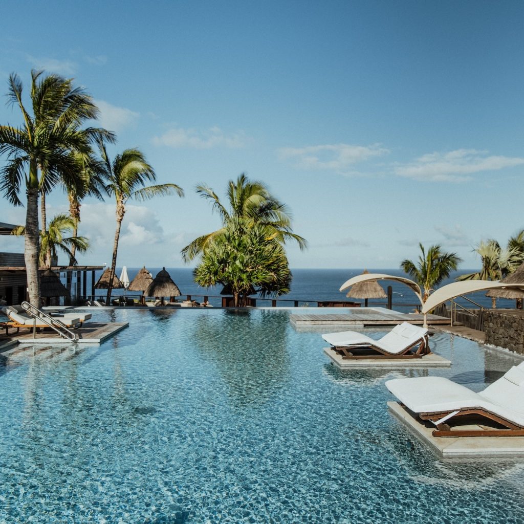 Le Palm Hotel & Spa propose une expérience unique au sud de l’île de la Réunion. Cet établissement de luxe surplombe la baie de Grande Anse. Il offre une vue imprenable sur l’océan Indien. Tu profites d’une piscine à débordement qui semble se fondre dans l’horizon. C’est un lieu idéal pour ralentir le rythme et savourer le calme. (C. Image : Salty Agency)