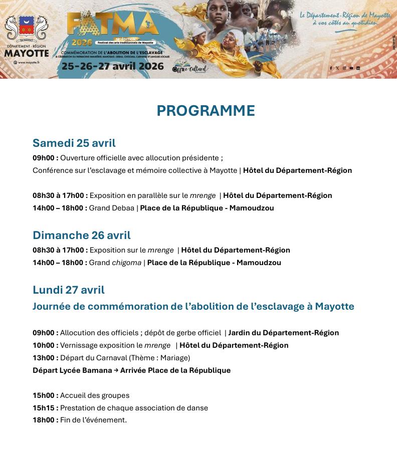 Le FATMA 2026 s’affirme comme un rendez-vous historique majeur. Du 25 au 27 avril 2026, le Département-Région de Mayotte organise des journées dédiées à l’abolition de l’esclavage. Cet événement se déroule à l’Hôtel du Département et sur la Place de la République à Mamoudzou. Il rassemble des historiens, des artistes et des citoyens. Le projet vise à transformer une mémoire parfois douloureuse en une force pour l’avenir. Tu découvriras une culture vivante et en mouvement.