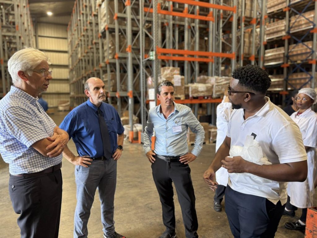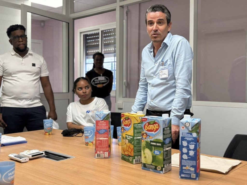 Le préfet de région, Thierry Devimeux, a visité les installations de l’entreprise Jus de Fruits Caraïbes (JFC) à Baie-Mahault. Cette société familiale possède 44 ans d’histoire. Elle domine le marché des boissons aux fruits en Guadeloupe. L’entreprise produit 13 millions de litres chaque année. Elle emploie une quarantaine de salariés. Ses marques célèbres comme Banga, Pampryl, Jacko ou Fraîcheur Créole rayonnent dans tout l’arc antillais. (C. Image : Préfecture de Guadeloupe)