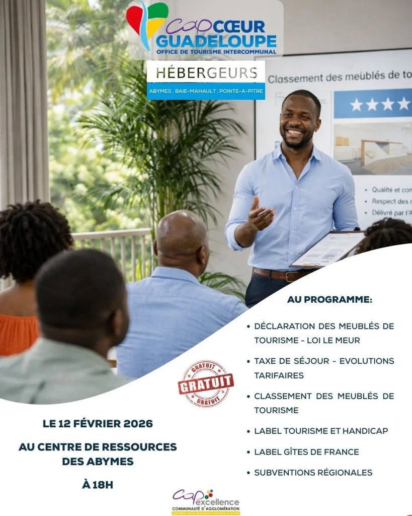 Vous gérez un gîte, une villa ou une chambre d’hôte aux Abymes, à Baie-Mahault ou à Pointe-à-Pitre. Votre quotidien change. La réglementation évolue. Vous devez rester compétitif pour attirer des voyageurs du monde entier. L’Office de Tourisme Intercommunal Cap Cœur Guadeloupe vous invite à une rencontre stratégique. Ce rendez-vous gratuit transforme vos contraintes administratives en leviers de croissance.