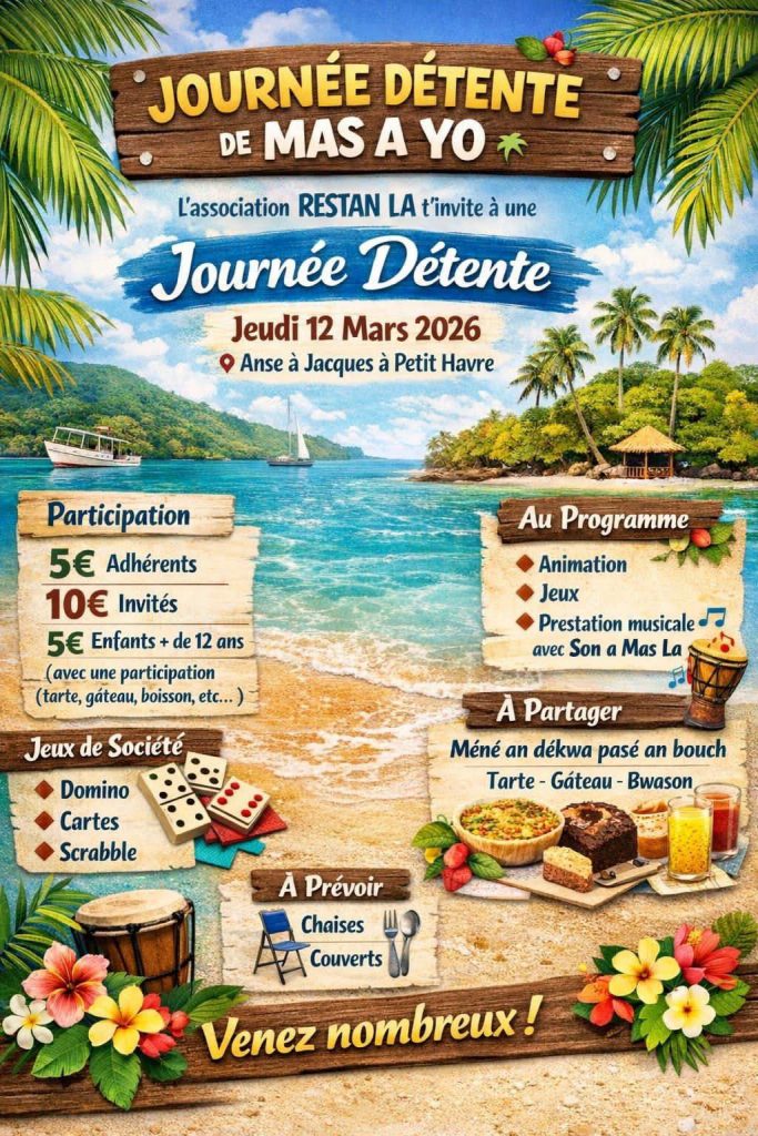 L’association Restan-la Kiltiétradision et le groupe Mas A Yo t’invitent à un moment de partage exceptionnel. Le jeudi 12 mars 2026, rendez-vous à l’Anse à Jacques, Petit-Havre. Cette rencontre célèbre l’art de vivre en Guadeloupe. C’est une occasion parfaite pour découvrir les traditions de l’Outre-mer.