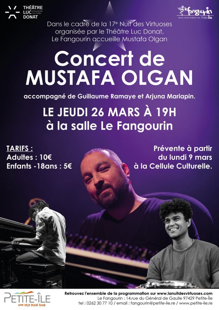 La musique s’invite au sud de l’île pour une soirée mémorable. Le jeudi 26 mars 2026, la salle Le Fangourin accueille un rendez-vous culturel majeur. Cet événement s’inscrit dans le cadre de la 17ème Nuit des Virtuoses. Le spectacle débute à 19h précises. Tu découvriras sur scène Mustafa Olga, un artiste de talent. Il partage l’affiche avec Guillaume Ramaya et Arjuna Mariapin. La Ville de Petite-Île soutient cette initiative artistique de haut niveau. Outre-mer Tourisme te conseille de réserver rapidement ta place pour ce moment unique.