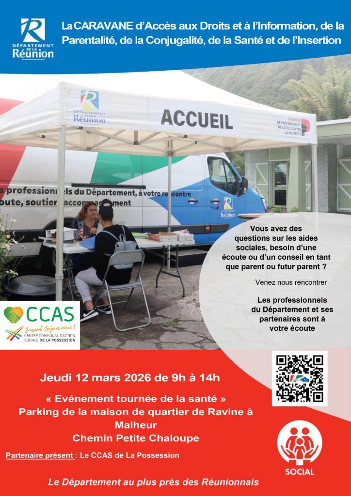 Rends-toi sur le parking de la Maison de Quartier de Ravine à Malheur. Le rendez-vous est fixé au jeudi 12 mars 2026. Les professionnels t’attendent de 9h à 14h. Le CCAS de La Possession participe activement à cette journée. Tu trouveras des réponses concrètes à tes interrogations quotidiennes.
