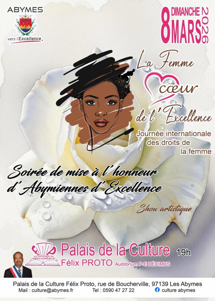 Le dimanche 8 mars 2026 marque une date essentielle pour la Ville des Abymes. Le Palais de la Culture Félix PROTO accueille une soirée prestigieuse dès 19h. Cet événement intitulé La Femme cœur de l’Excellence met en lumière des parcours exceptionnels. Tu assisteras à des mises à l’honneur de femmes inspirantes et à un show artistique de haute qualité. Cette célébration coïncide avec la Journée internationale des droits des femmes. Elle renforce le rayonnement culturel de l’archipel dans tout le bassin des Caraïbes.