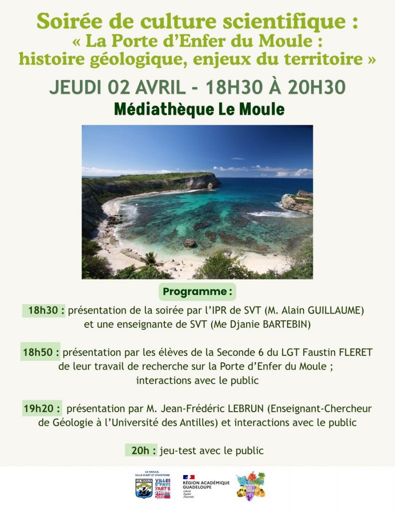 Le jeudi 2 avril prochain. La Médiathèque du Moule accueille une conférence fascinante sur la culture scientifique. De 18h30 à 20h30. Tu découvriras les secrets de la Porte d’Enfer. Ce site naturel exceptionnel raconte l’histoire de la Guadeloupe. L’entrée est libre pour tous les passionnés de géologie et de patrimoine.