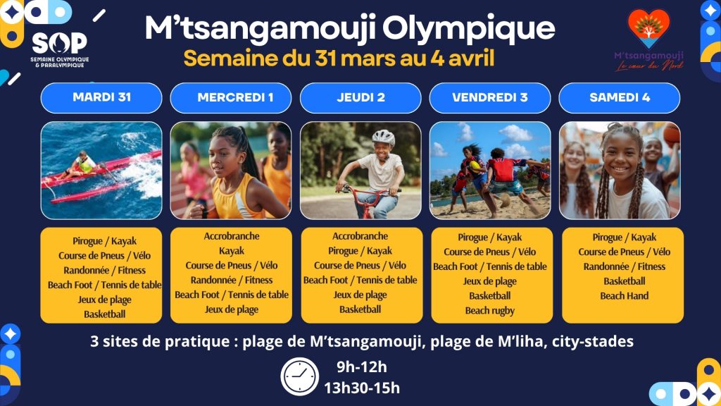 M’tsangamouji devient le centre de l’olympisme du 31 mars au 4 avril 2026. Cette édition de la Semaine Olympique et Paralympique (SOP) transforme la ville en un terrain de jeu géant. La municipalité organise cet événement pour promouvoir l’inclusion et le dépassement de soi. Tu peux découvrir des disciplines variées et rencontrer des sportifs de haut niveau. Outre-mer Tourisme conseille cette période pour visiter l’île de façon active et citoyenne.