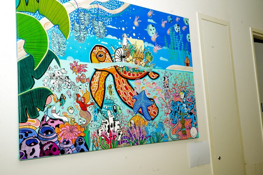 La clinique Kuindo Magnin transforme son service de chimiothérapie en galerie d’art. Le projet « Des couleurs pour soulager les maux » apporte du réconfort aux patients. Dix fresques réalisées par des artistes calédoniennes ornent désormais les murs. L’association Soroptimist International Club de Nouméa porte cette initiative. La Province Sud soutient financièrement cette action à hauteur de 80 %, soit 2 000 000 CFP. Ce projet a remporté le budget participatif « Mon idée pour ma Province » 2023. (C. Image : Province Sud)