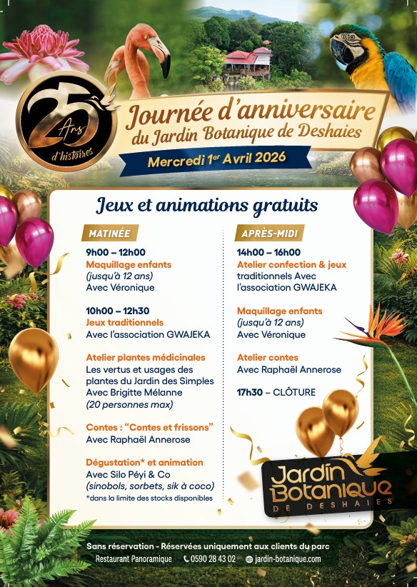 Le Jardin Botanique de Deshaies célèbre son quart de siècle. Ce site emblématique de la Guadeloupe organise une journée festive le mercredi 1er avril 2026. Cet anniversaire marque une étape majeure pour le tourisme durable en Outre-mer. Tu peux découvrir ce paradis vert de 9h00 à 17h30. L’entrée donne accès à des animations gratuites et sans réservation. Ce lieu reste une vitrine exceptionnelle pour la biodiversité des Caraïbes.