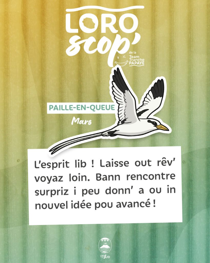 Le mois de mars s’annonce sous le signe de la sérénité pour les natifs du Paille-en-Queue. La Team Tranche Papaye dévoile ses prévisions pour cette période de transition. Tu reçois un conseil précieux pour ton bien être : laisse ton esprit respirer. Ce mois t’invite à rêver grand et à sortir de ta routine quotidienne. L’influence de cet oiseau emblématique de l’île t’encourage à prendre de la hauteur sur tes projets personnels et professionnels.