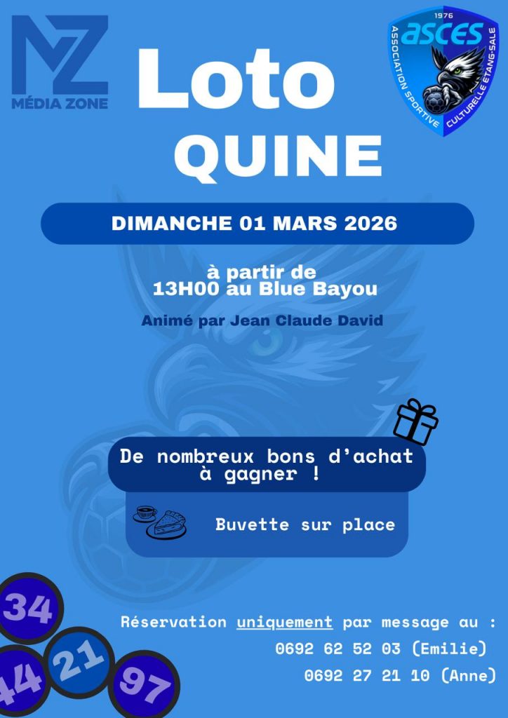 L’association sportive ASCES t’invite à participer à son grand Loto Quine. Ce rendez-vous convivial se déroule le dimanche 1 mars 2026. Les festivités commencent à 13h. Le rendez-vous est fixé au restaurant Blue Bayou, situé dans la Ville de L’Étang-Salé. Cet événement rassemble les passionnés de jeux et les familles autour d’un moment de partage.