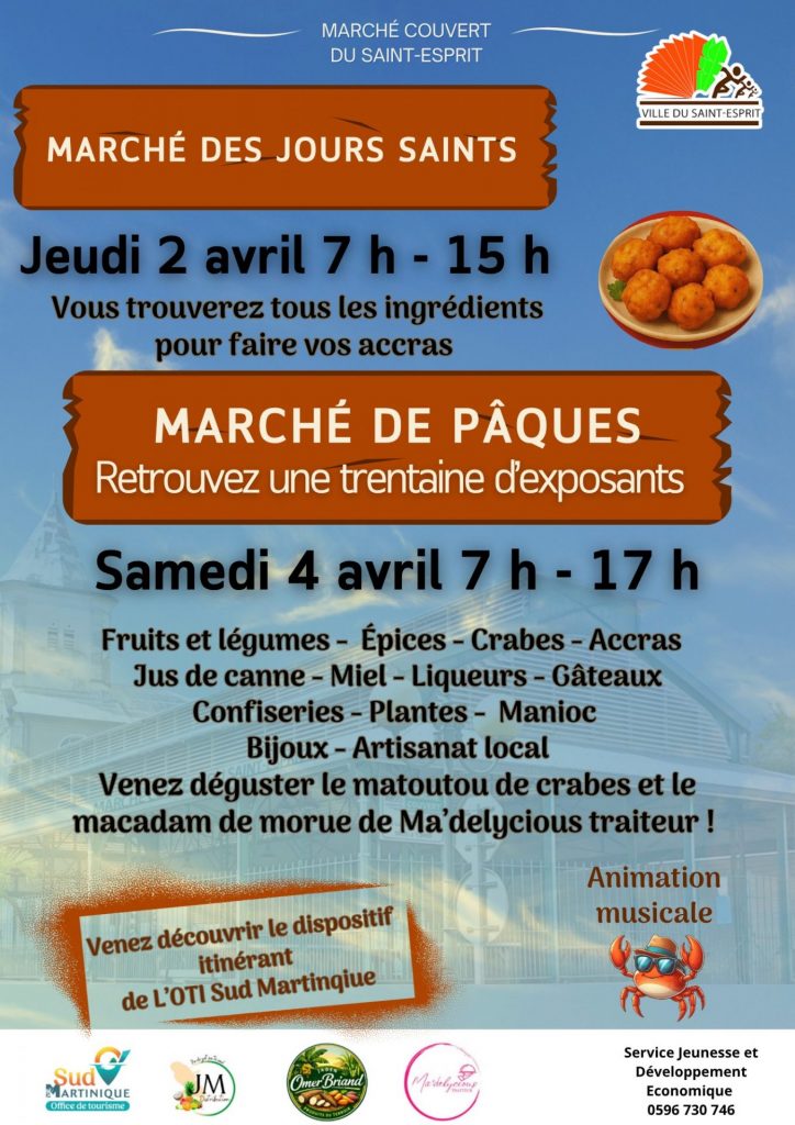 La Ville du Saint-Esprit organise deux événements majeurs pour les fêtes de Pâques. Le premier rendez-vous se tient le jeudi 2 avril 2026 pour le Marché des Jours Saints. Tu y trouveras tout le nécessaire pour cuisiner tes accras. Le second moment fort a lieu le samedi 4 avril 2026 pour le grand Marché de Pâques. Ces festivités se déroulent au Marché couvert du bourg. Outre-mer Tourisme te conseille de visiter ce lieu authentique pour découvrir les saveurs locales de la région.