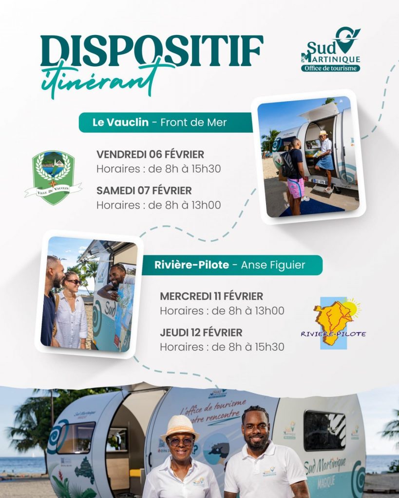 Le Sud de la Martinique bouge en février. Notre dispositif itinérant parcourt les routes pour t’offrir un accueil personnalisé. Que tu sois résident ou visiteur. Nous venons à ta rencontre pour faciliter tes démarches et enrichir ton séjour.