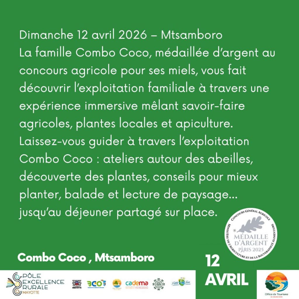 L’apiculture de Mayotte brille au sommet. Un miel local vient de recevoir une médaille à Paris. Cette distinction confirme la qualité exceptionnelle des produits de la région. Le Pôle d’Excellence Rurale de Coconi soutient cette dynamique de valorisation. Ce dimanche 12 avril. Tu as rendez-vous à Mtsamboro chez Combo Coco. Cet événement s’inscrit dans le programme « Karibumalavuni« . L’Office de Tourisme du Grand Nord de Mayotte organise cette journée. Tu ne vas pas seulement visiter une exploitation. Tu vas vivre une expérience agricole totale. (C. Image : Pôle d’Excellence Rurale de Coconi)