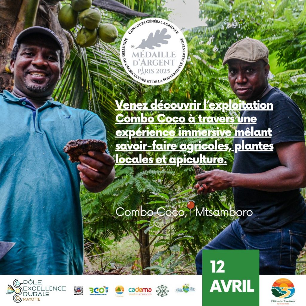 L’apiculture de Mayotte brille au sommet. Un miel local vient de recevoir une médaille à Paris. Cette distinction confirme la qualité exceptionnelle des produits de la région. Le Pôle d’Excellence Rurale de Coconi soutient cette dynamique de valorisation. Ce dimanche 12 avril. Tu as rendez-vous à Mtsamboro chez Combo Coco. Cet événement s’inscrit dans le programme « Karibumalavuni« . L’Office de Tourisme du Grand Nord de Mayotte organise cette journée. Tu ne vas pas seulement visiter une exploitation. Tu vas vivre une expérience agricole totale. (C. Image : Pôle d’Excellence Rurale de Coconi)