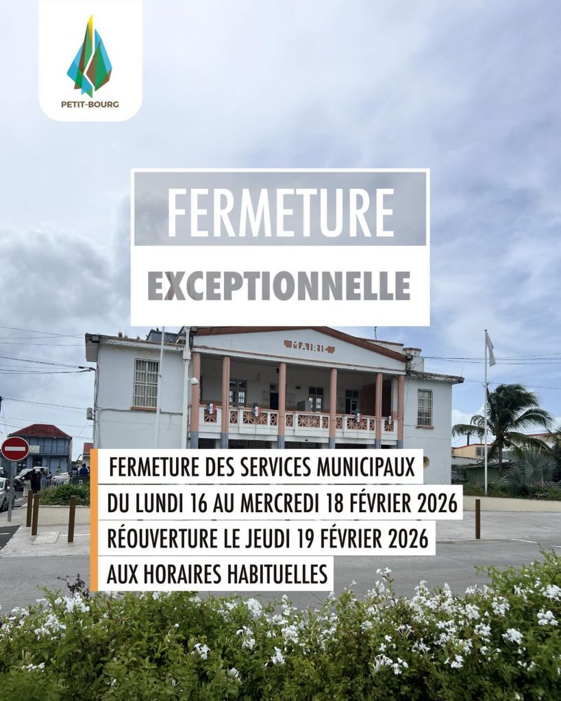 La Ville du Petit-Bourg informe ses administrés d’un changement temporaire d’organisation. Les services municipaux ferment leurs portes du lundi 16 au mercredi 18 février 2026. Cette mesure concerne l’ensemble des bureaux administratifs de la commune. Tu dois anticiper tes démarches pour éviter tout désagrément. La réouverture se fera le jeudi 19 février 2026 selon les horaires habituels.