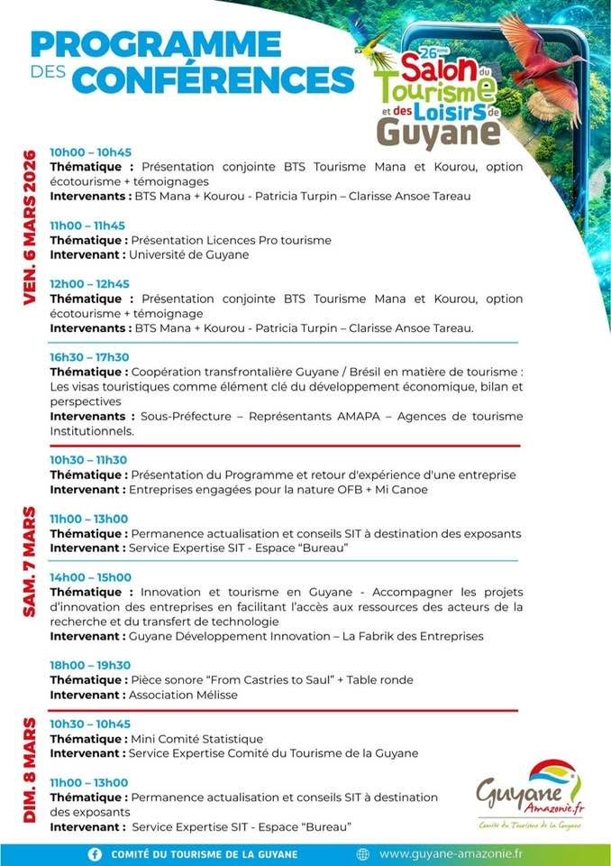 Le Salon du Tourisme et des Loisirs 2026 propose un volet intellectuel et stratégique majeur. Le Comité du Tourisme de la Guyane organise une série de conférences pour transformer le secteur. Du 05 au 08 mars 2026, les experts se réunissent au PROGT de Matoury. Outre-mer Tourisme, ton conseiller touristique privilégié, t’invite à participer à ces échanges essentiels pour le rayonnement de la Guyane en Outre-mer.