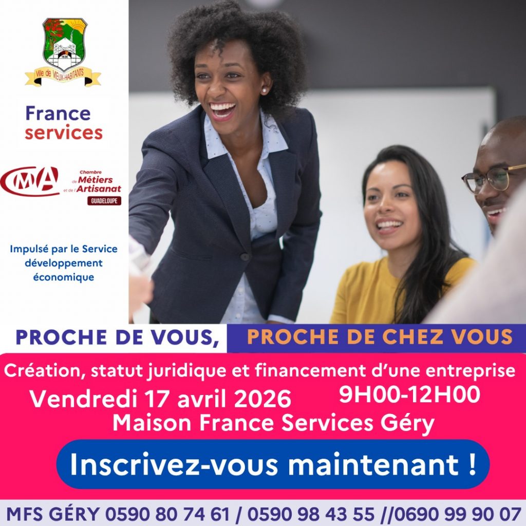 - Création d’entreprise : Le vendredi 17 avril 2026. Le rendez-vous se tient de 9h00 à 12h00. Tu découvriras les statuts juridiques et les options de financement. Le lieu est la Maison France Services Géry.