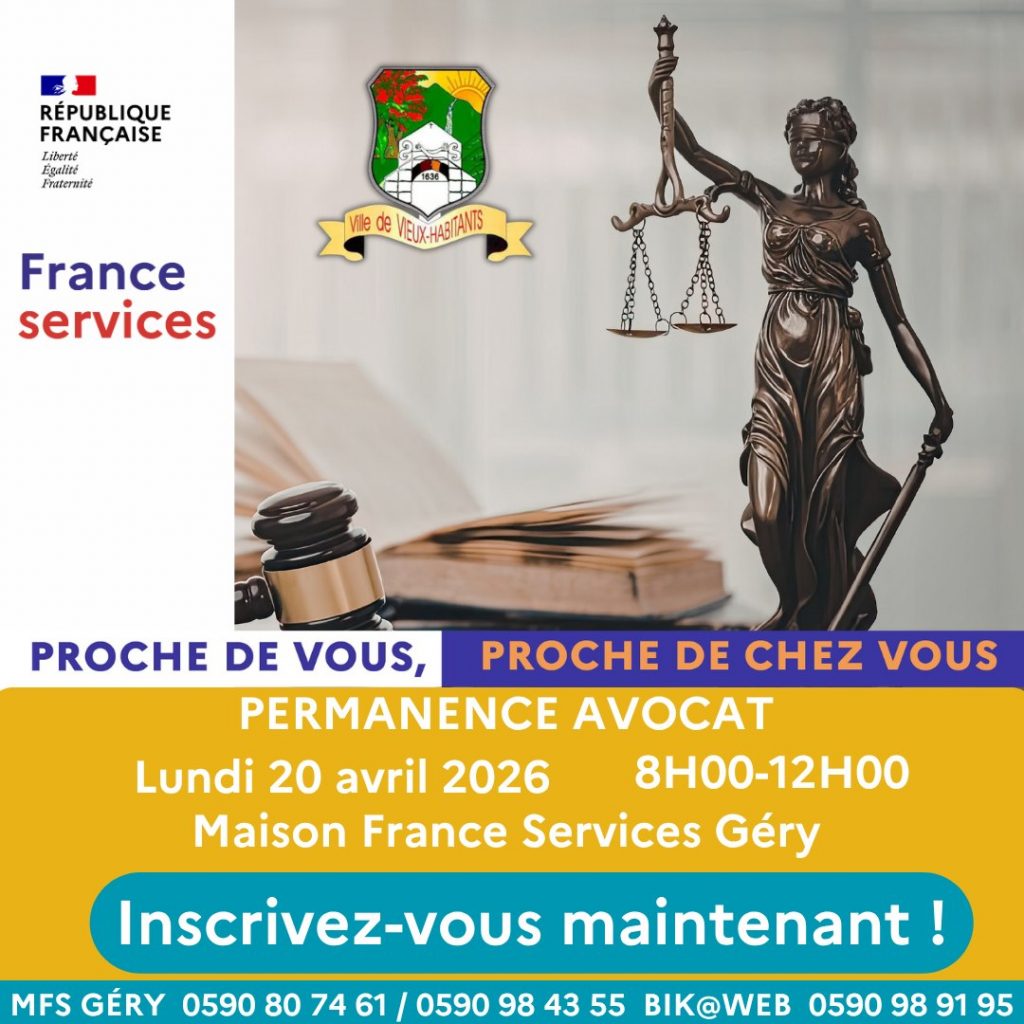 - Permanence avocat : Le lundi 20 avril 2026. Tu profites de conseils juridiques gratuits. Les experts t’accueillent de 8h00 à 12h00 à la Maison France Services Géry.