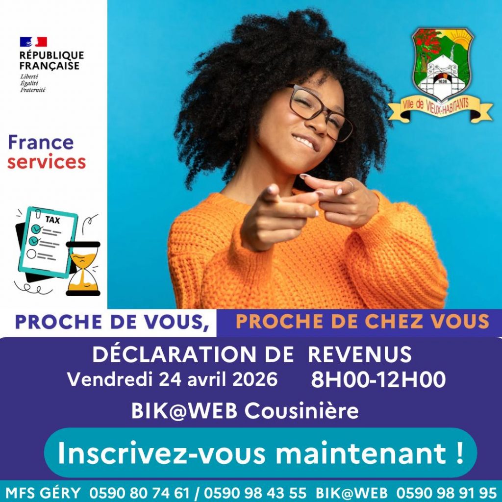 - Aide à la déclaration de revenus : Deux dates sont disponibles. Le vendredi 24 avril 2026 au BIK@WEB Cousinière. Le mercredi 13 mai 2026 à la Maison France Services Géry. Les créneaux vont de 8h00 à 12h00.