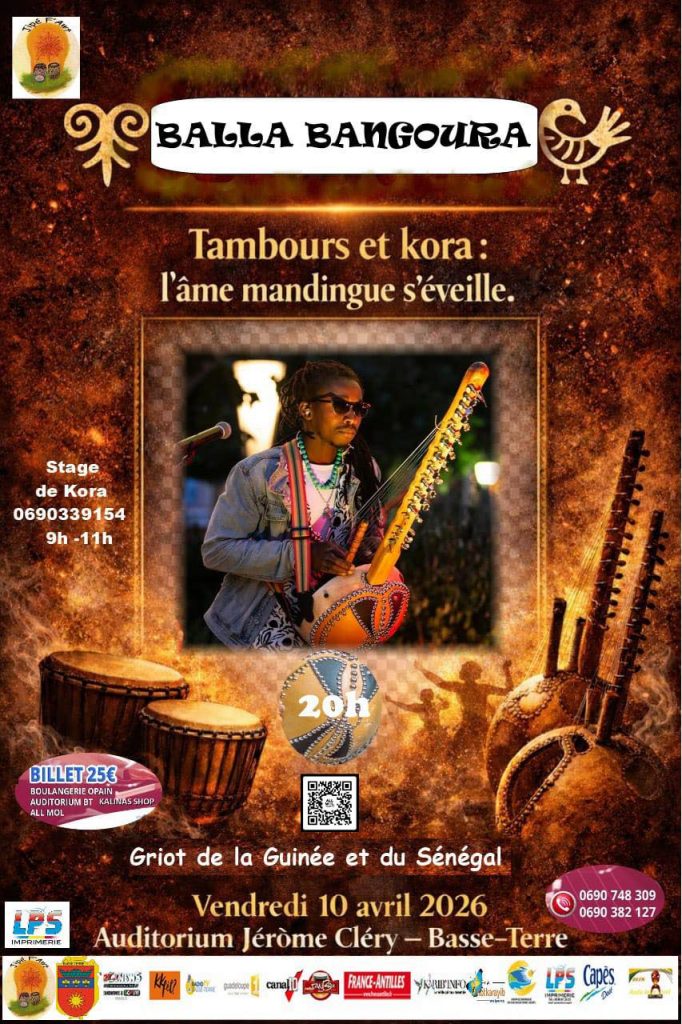 La Ville de Basse-Terre t’invite à une immersion culturelle unique en Guadeloupe. Le vendredi 10 avril 2026, l’Auditorium Jérôme Cléry accueille une figure emblématique de la musique africaine. Balla Bangoura, griot reconnu de la Guinée et du Sénégal, présente son spectacle « Tambours et kora : l’âme mandingue s’éveille ». Cet événement met en lumière la richesse des traditions orales et musicales. Tu découvriras des sonorités ancestrales portées par la kora, cette harpe-luth majestueuse. La soirée débute à 20h pour une prestation chargée d’émotion et de transmission.