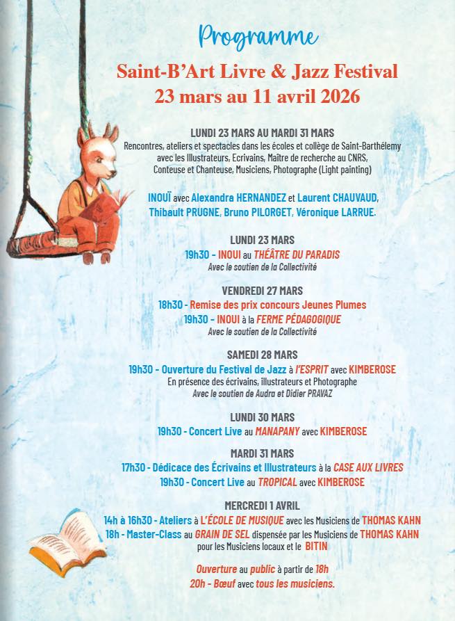 Cette semaine, l’île vibre au rythme de la culture et des traditions. Le Saint B’Art Livre & Jazz Festival ouvre le bal dès aujourd’hui. Il se termine le 11 avril. Ce festival mélange la littérature et la musique pour offrir des performances live marquantes. Vous profitez d’une ambiance élégante et festive. (C. Image : Tourisme Saint-Barth)