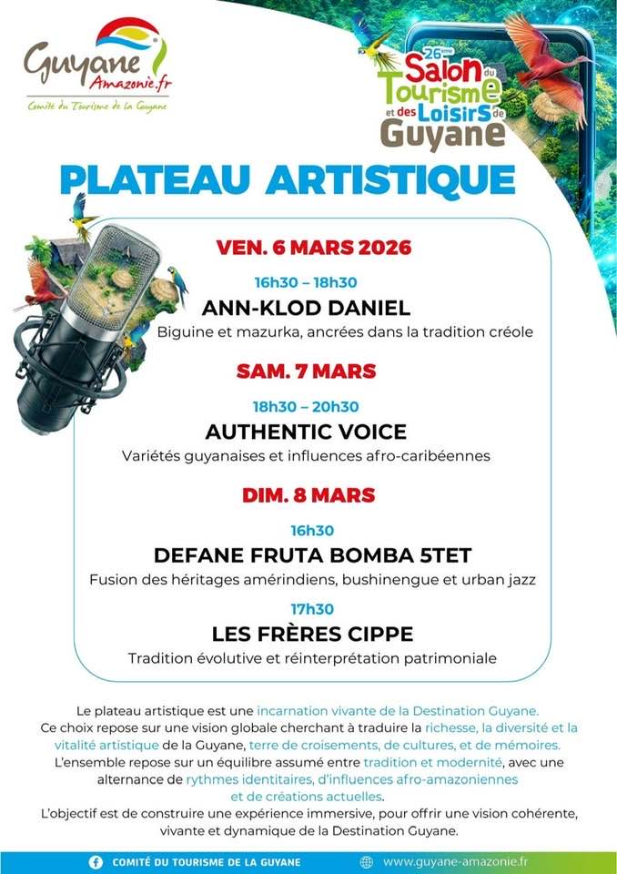 Le Salon du Tourisme et des Loisirs 2026 ouvre ses portes pour une édition exceptionnelle. Le Comité du Tourisme de la Guyane t’invite à découvrir la richesse de son territoire. Cet événement majeur se déroule au PROGT de Matoury du 05 au 08 mars 2026. Outre-mer Tourisme, ton conseiller touristique expert, te présente le plateau artistique qui animera ces quatre jours intenses en Guyane.