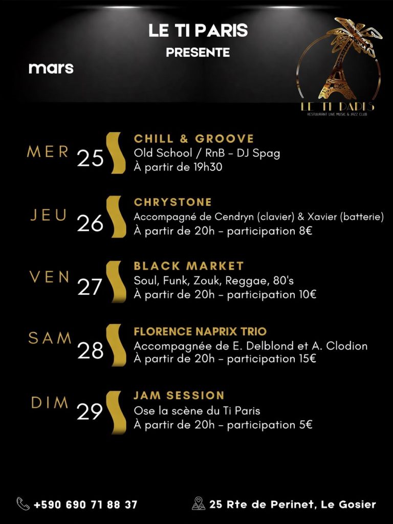 - Vendredi 27 mars : Groupe Black Market. Ils jouent de la Soul, du Funk, du Zouk et du Reggae. Retrouve Shouba, David Berald, Danyboy, Willy Blonbou et Daniel Kissoun. L’entrée est à 10 euros dès 20h.