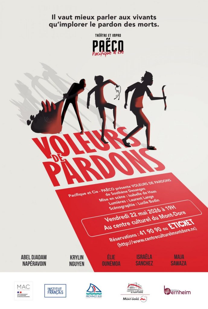 La scène culturelle de Nouvelle-Calédonie s’apprête à vibrer. Le vendredi 22 mai 2026, le Centre Culturel du Mont-Dore accueille la pièce Voleurs de Pardons. La Compagnie Paëco – Pacifique et Cie propose une création intense. Ce spectacle de 1 h 30 s’adresse à tout public. Tu découvriras l’histoire de trois jeunes dont le cambriolage tourne à la rencontre imprévue. Un secret lourd lie désormais les personnages. (C. Image : Centre Culturel du Mont-Dore)