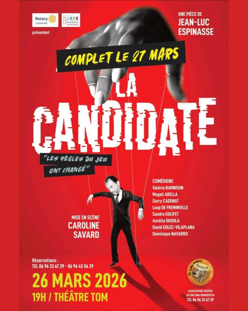 Le jeudi 26 mars 2026, le Théâtre Tom devient le théâtre d’une tension extrême. Tu as rendez-vous à 19h pour découvrir La Candidate / El Lobo Bueno. Ce thriller psychologique plonge huit personnages dans un huis clos étouffant. Un million d’euros est en jeu. Un animateur veut tout maîtriser. Une candidate refuse de céder. Théâtre Martinique soutient cette initiative culturelle majeure. L’association El Lobo Bueno produit ce spectacle au profit du Rotary Club du Lamentin.