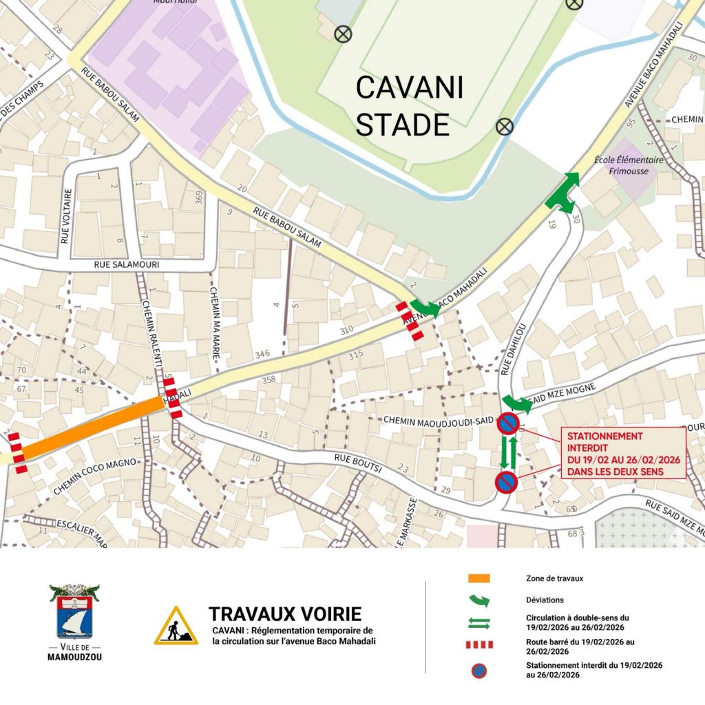 La Ville de Mamoudzou engage des travaux de voirie importants sur l’avenue Baco Mahadali à Cavani. Ce chantier modifie vos habitudes de déplacement du 19 au 26 février 2026. Anticipez vos trajets pour traverser ce secteur de Mayotte sans stress.