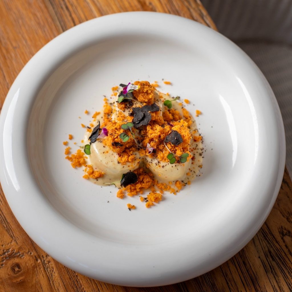 Le restaurant Le Makassar dévoile une création culinaire audacieuse. Il s’agit du palmiste travaillé selon l’inspiration d’un gratin. Cette recette sublime un produit phare de La Réunion. Elle marie la douceur d’une crème de chèvre de Takamaka légèrement fumée à un crumble au parmesan. L’ajout de truffe et de piment z’oiseau apporte un équilibre parfait entre luxe et tradition locale. Tu découvres ici une table d’exception située au sein du Palm Hotel & Spa à Petite île. (C. Image : Palm Hotel & Spa)