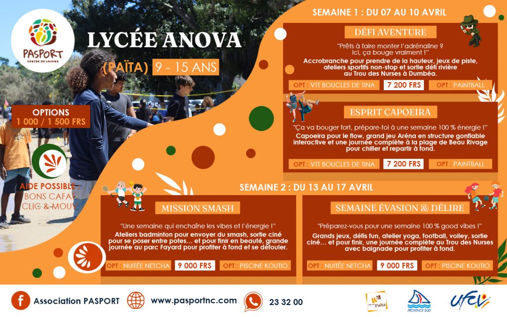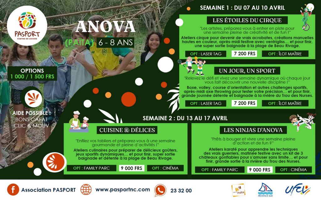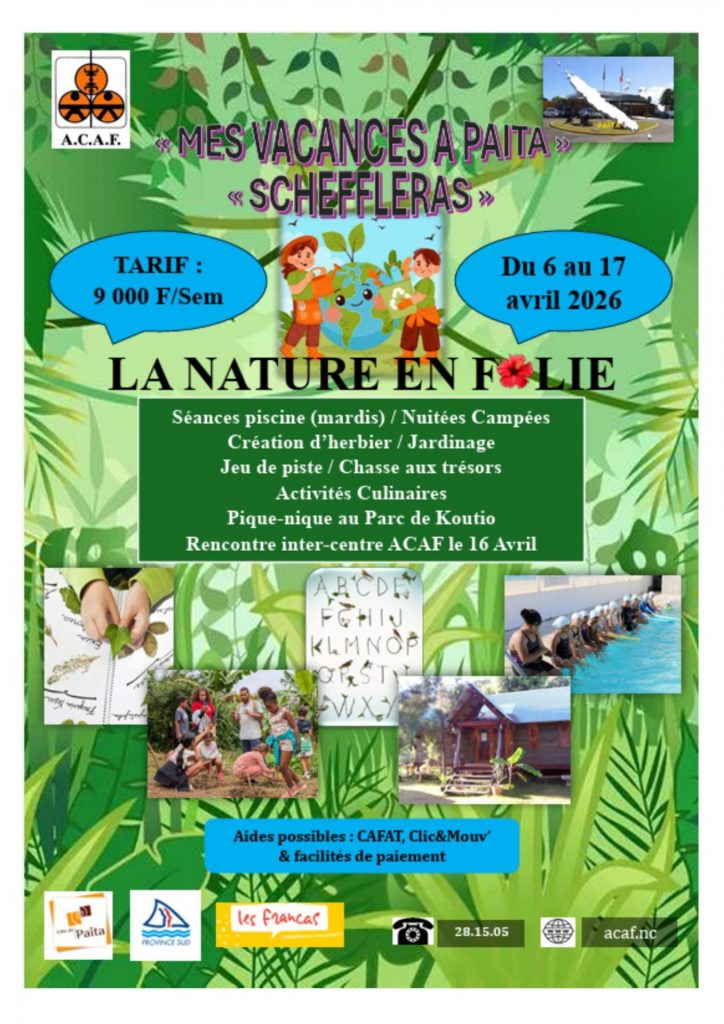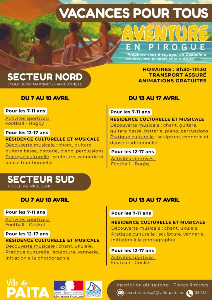 Les places sont limitées. Tu dois agir vite pour garantir une place à ton enfant. Rends-toi directement auprès des organisateurs cités. Les tarifs et les modalités varient selon l’activité choisie. Les sites de pratique se répartissent sur l’ensemble de la commune de Païta.