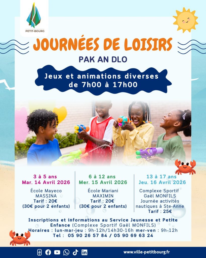 La Ville de Petit-Bourg dynamise la jeunesse avec l’événement PAK AN DLO. Ce programme propose des journées de loisirs intensives pour les enfants et les adolescents. Les activités se déroulent du 14 au 16 avril. Les parents peuvent inscrire leurs enfants dès maintenant pour garantir une place.