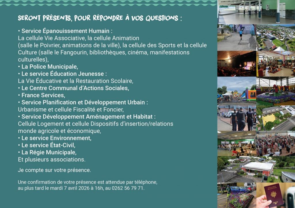 Tu n’as pas encore reçu ton carton d’invitation par courrier. Ce n’est pas un problème. Contacte le service communication au 0262 56 79 71. Fais-toi connaître rapidement pour confirmer ta présence. La mairie souhaite recenser chaque nouveau foyer pour ne oublier personne. Ta participation permet à la municipalité de mieux connaître ses nouveaux habitants.