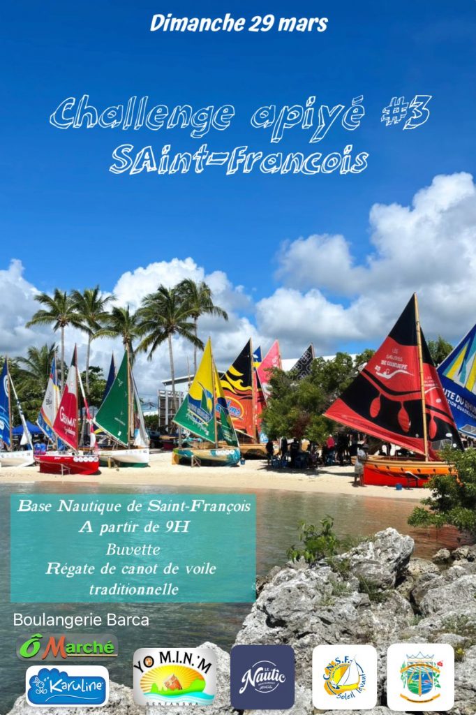 Le spectacle s’annonce grandiose ce dimanche. La plage de la base nautique accueille la troisième étape du Challenge Apiyé. Cette compétition met à l’honneur la voile traditionnelle. Le Club Nautique de Saint-François (CNSF) orchestre l’événement. La ville de Saint-François soutient activement cette manifestation sportive. Les premiers départs auront lieu à 9h. Tu découvriras des embarcations authentiques et une ambiance unique sur le littoral guadeloupéen.